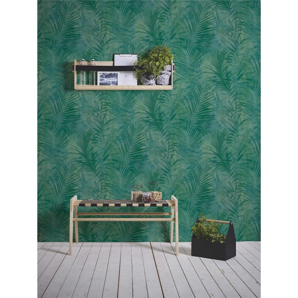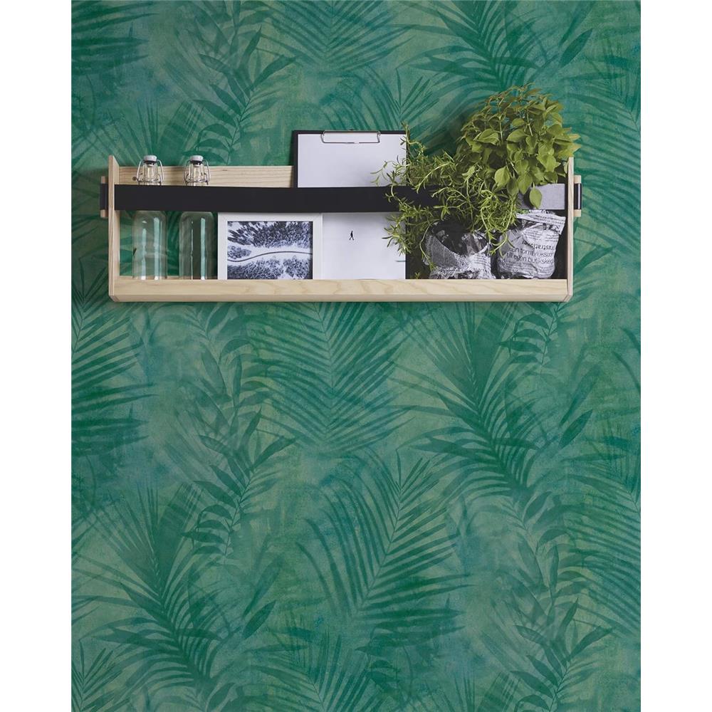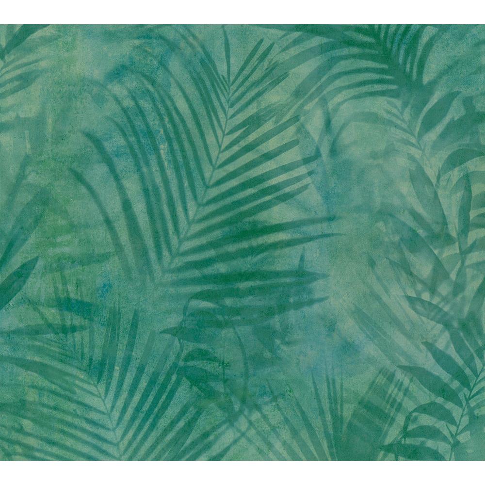 A.S. Création Neue Bude – Tropical Concret mit Palmenblättern in Grün und Blau