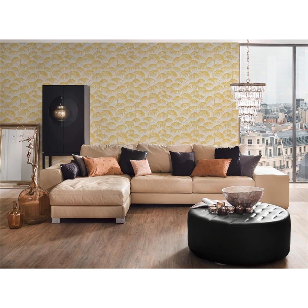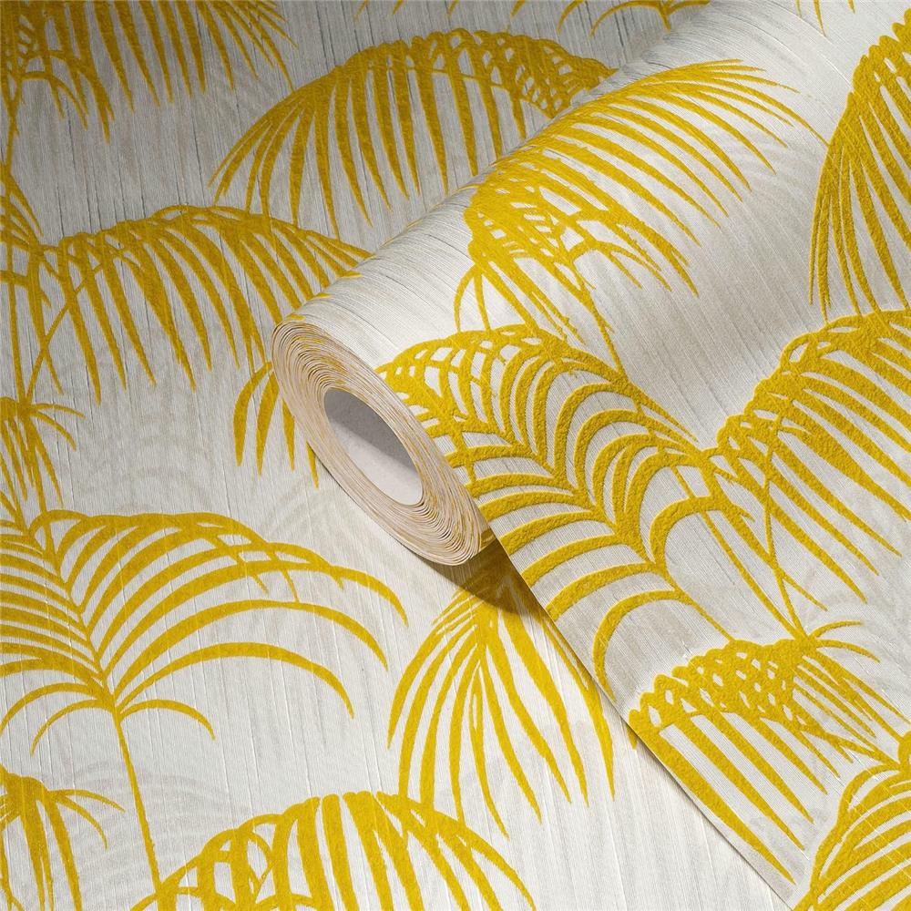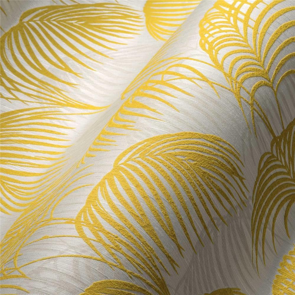 Die hochwertige Textiltapete aus der Kollektion Tessuto 2 von Architects Paper kombiniert ein edles Design mit praktischen Verarbeitungseigenschaften. Der stilvolle Palmenprint in Gelb Metallic bringt tropisches Flair und einen Hauch von Luxus an Ihre Wände – ideal für besondere Akzente im Wohn- oder Objektbereich.