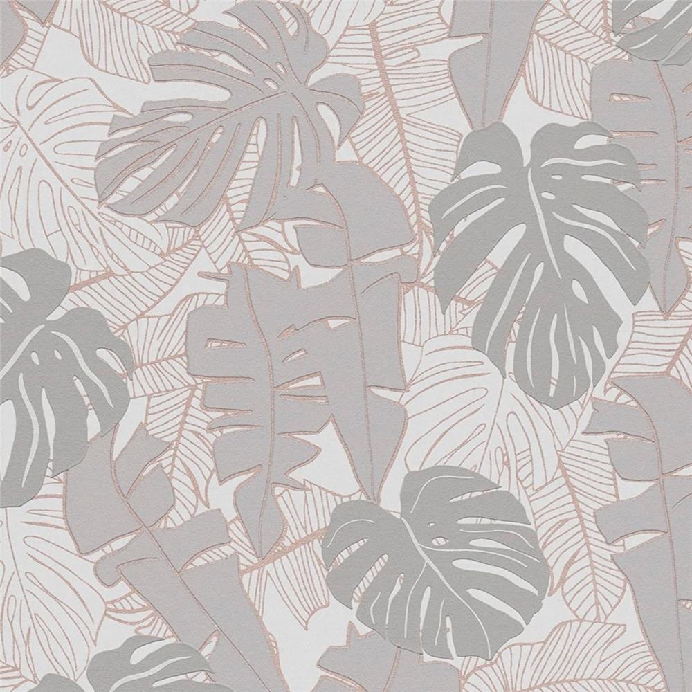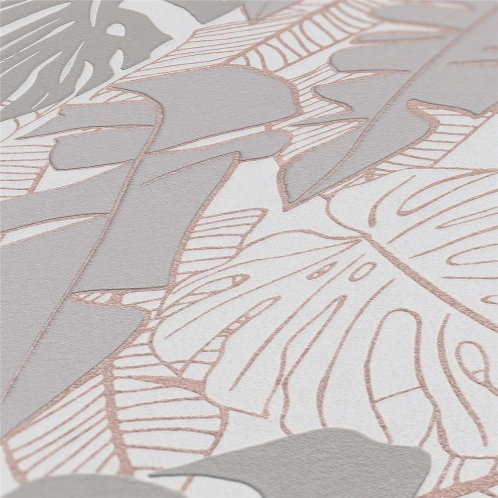 - Design: Palmentapete in Grau und Bronze mit schimmerndem Muster und mattem Hintergrund